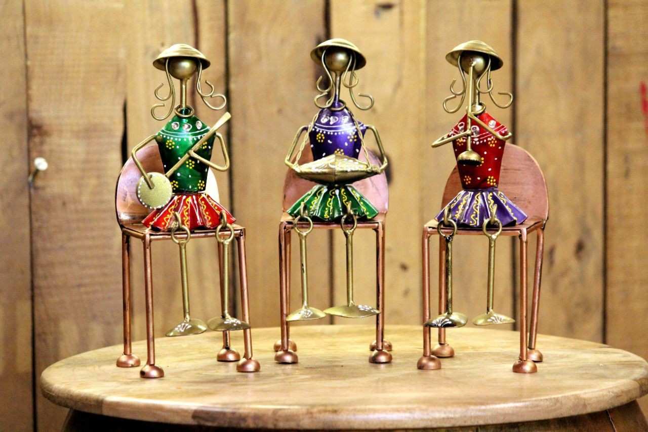 Kalakriti 3 Iron Tribal Lady Musician Table Top Showpiece for Home Decoration