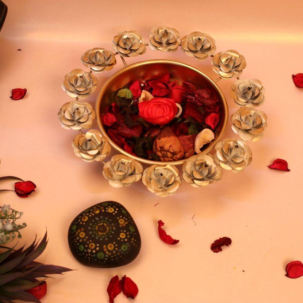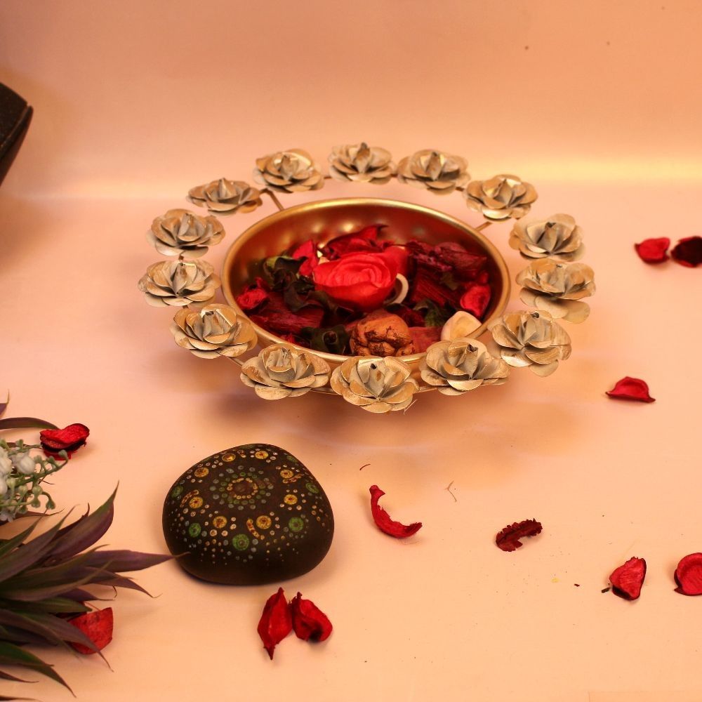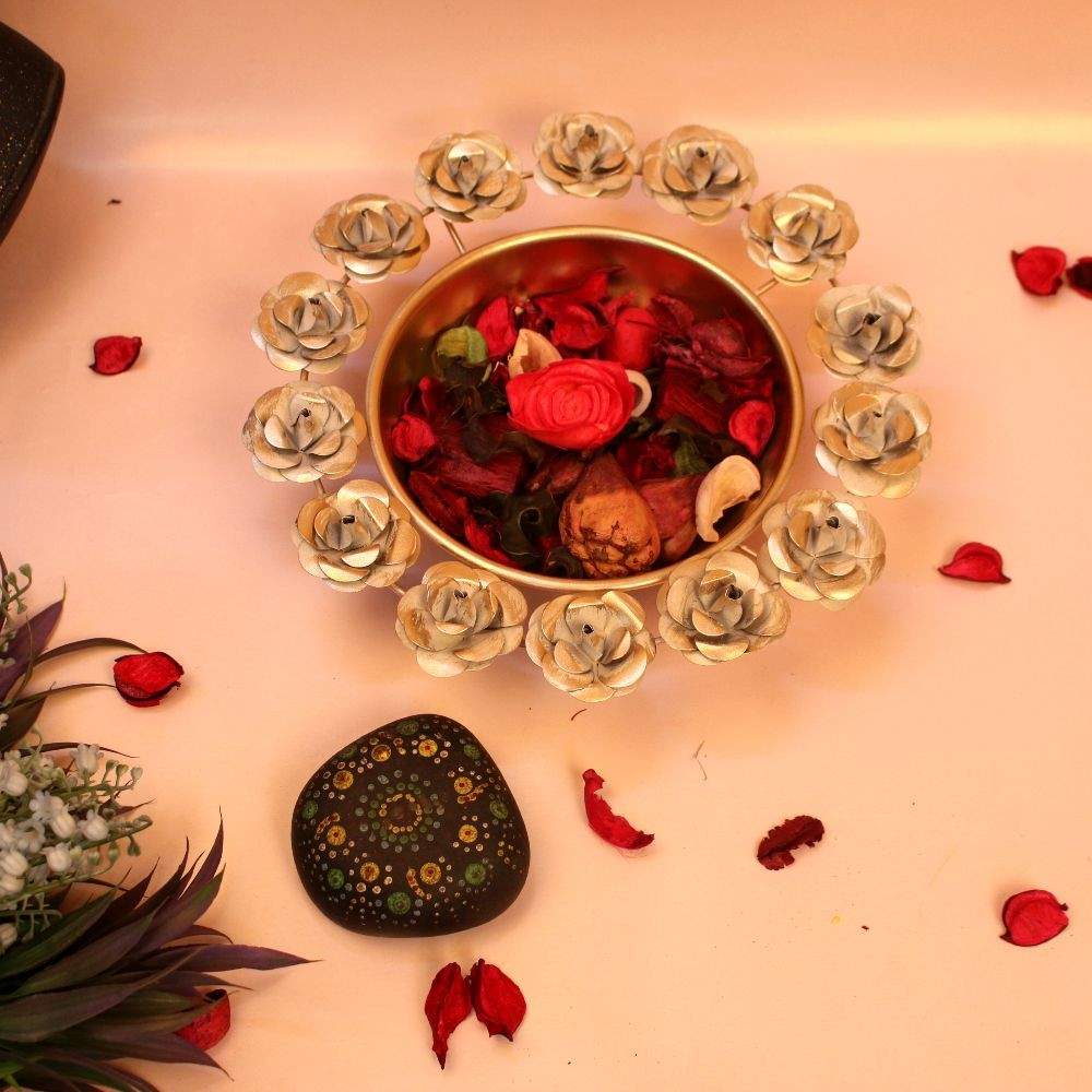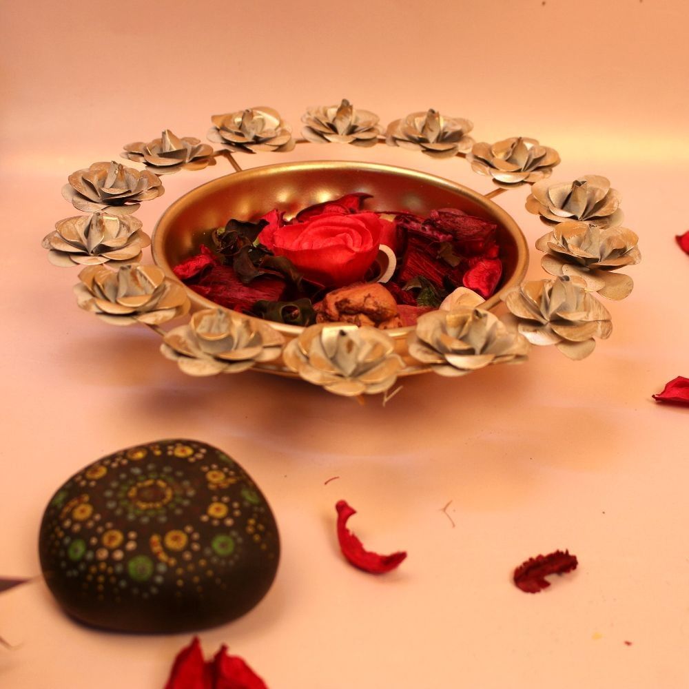 Decorative Urli Bowl with Flower Border – 10-inch decorative bowl, perfect for holding tea light candles. Adds a touch of elegance to your home decor and Diwali celebrations.