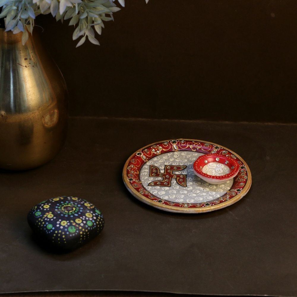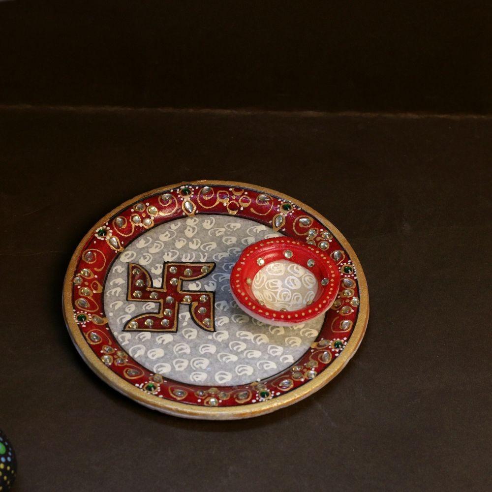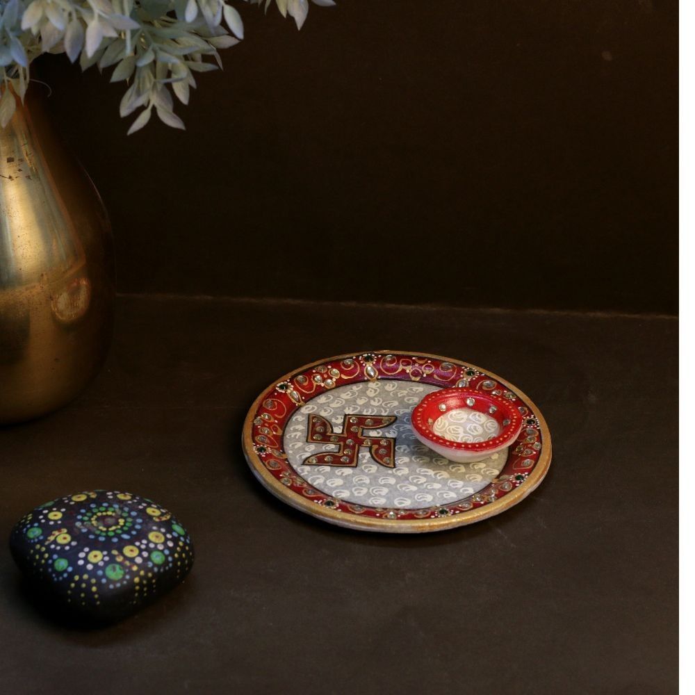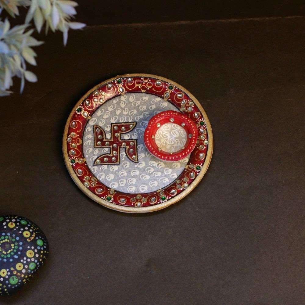 Decorative Meenakari Work Marble Round Pooja Thali with Printed Swastik - 6 inches