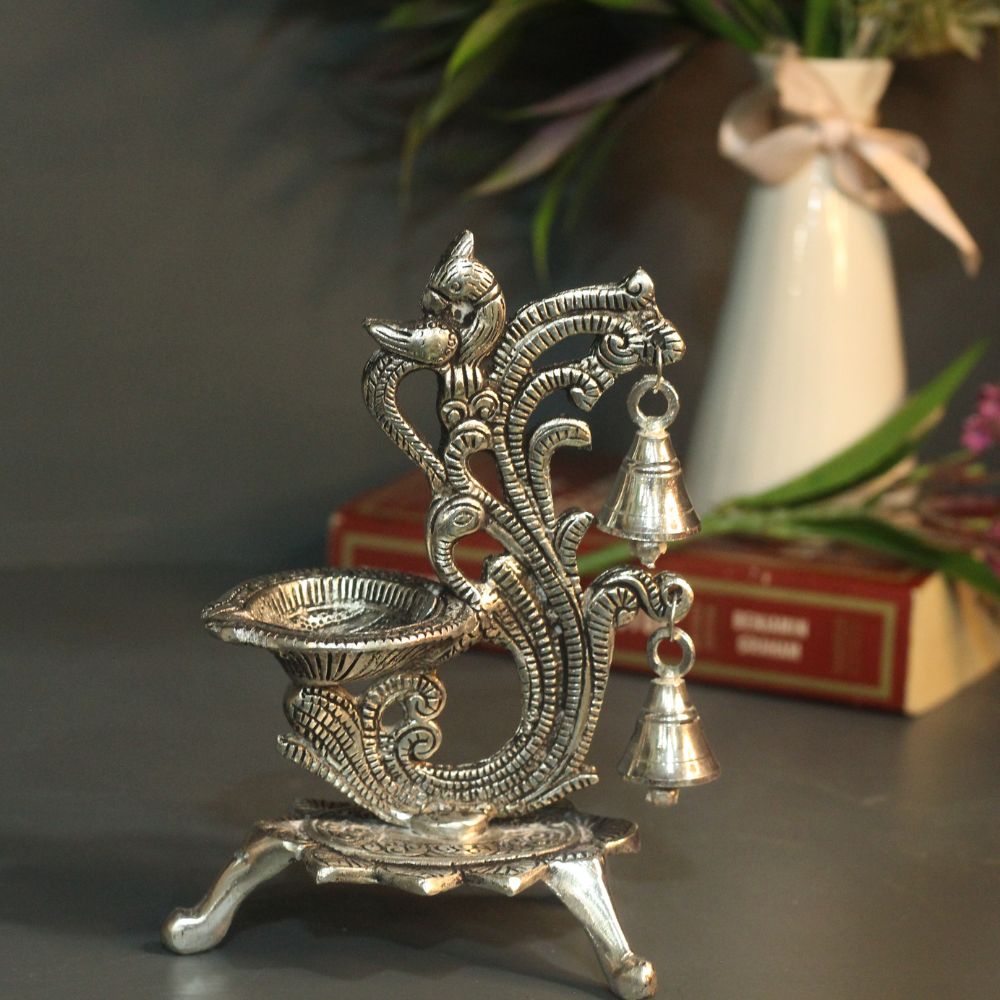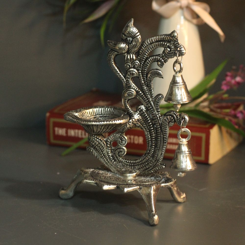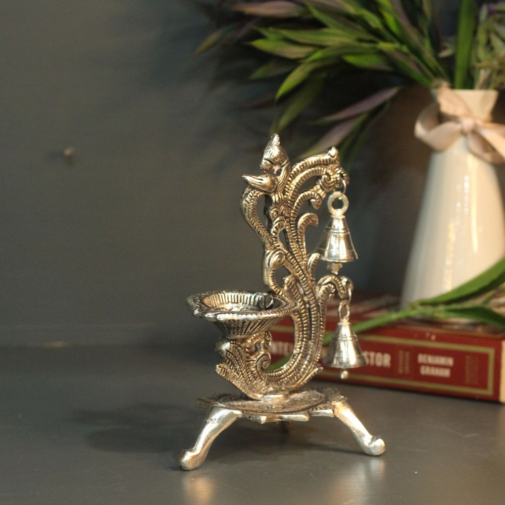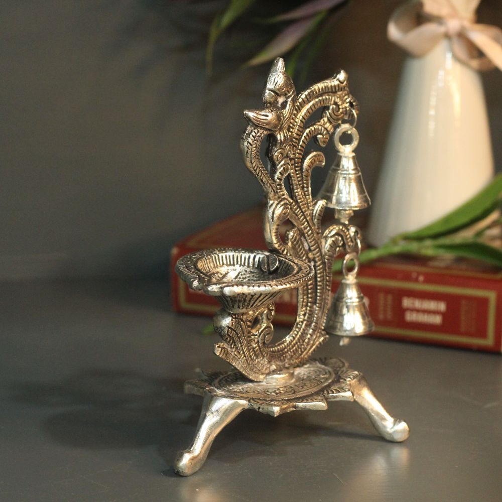 Beautiful Silver Metal Diya Stand with Double Ganti, 9x5.5 inches. A stunning decorative home decor accent, perfect for festive occasions, pooja, or as a unique gift.