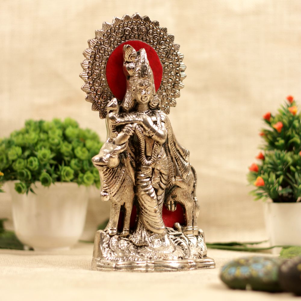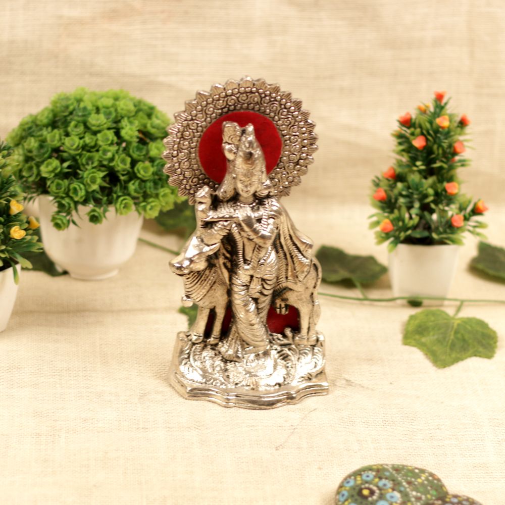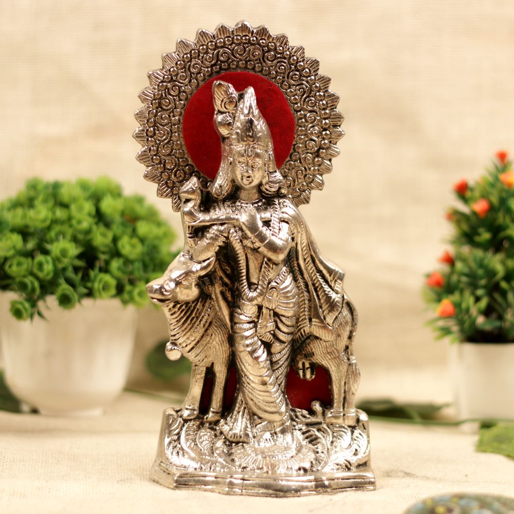 Metal Silver Plated Lord Krishna with Cow Showpiece, 5x9.5 inches. A stunning decorative piece for your home, embodying spirituality and elegance, perfect for gifting or personal decor.